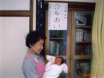 ●2004年5月3日(生後7日) 尼崎ばーちゃんがあいちゃんをだっこ! (ビデオからの画像です) |
