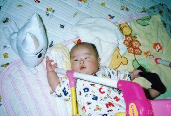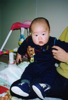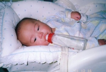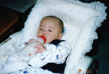 ●2001年12月1日(生後143日) ほ乳瓶を持ってるよ! でも、ガラスの瓶は重いな〜。 |