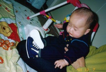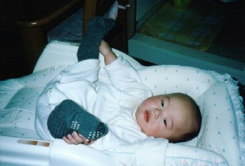 ●2001年12月12日(生後154日) ジムの中で、得意のポーズ。 ソックスぬぎぬぎ〜〜。 |