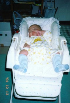 ●2001年12月16日(生後158日) 最近は、ほ乳瓶を持とうとしない・・・。 ずぼらになっちゃった。 |