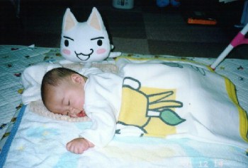 ●2001年12月14日(生後156日) 「とも君、あそぼ!」 あら、寝てる・・・と、トロ。 |