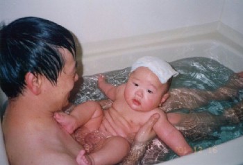 とーちゃんとお風呂。 ぼくのおなかは、果たして何段腹なんだろう? (お風呂写真は、かーちゃんの趣味かも) |