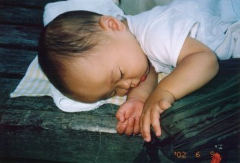●2002年6月7日(生後331日) 爆睡中です。 体がめちゃくちゃやわらかいのです。 左足の位置が・・・!! |